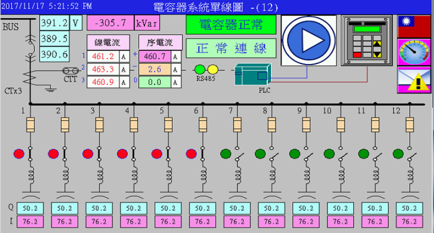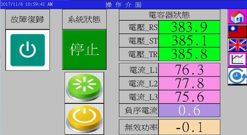 - 可選配人機介面,提供系統操作及參數輸入介面、電容器即時運轉資訊(三相電壓/電流/諧波電流、正序/負序/零序電流、電容器投入/切離/故障歷史紀錄、電容器容量柱狀圖、電壓趨勢圖、中英文介面切換選擇。