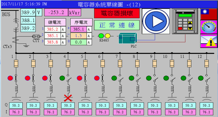 - 現異常狀態時,會自動隔離該段電容器避免事故並提供警報訊息。
